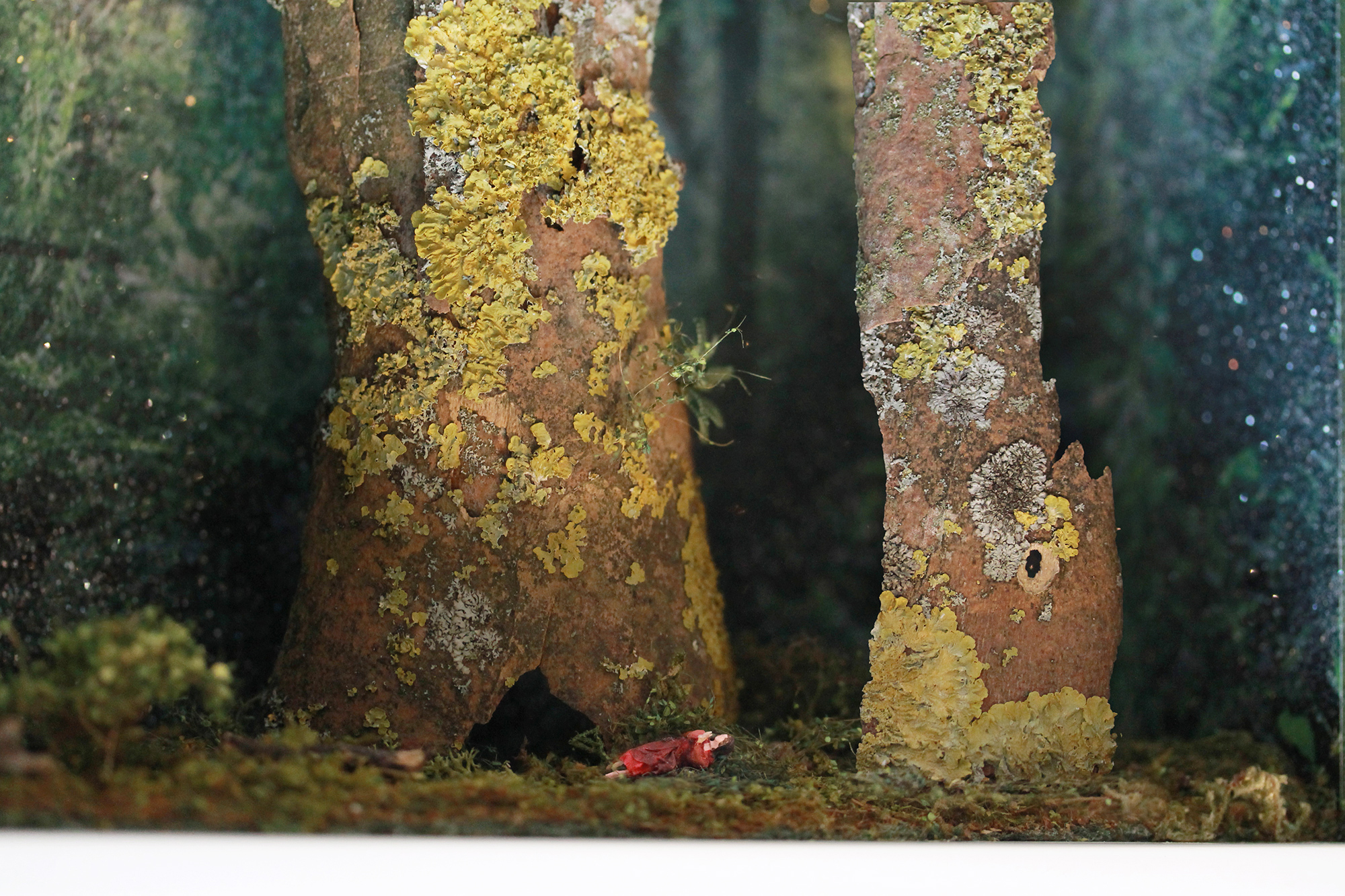 I remembered I had some dry pieces of lichen-covered bark that I'd picked up on Hampstead Heath in the autumn. Of course, in a Glass Cathedral, a small piece of bark transforms into a mighty tree trunk! And that is how I built up this world for tiny Agnes.